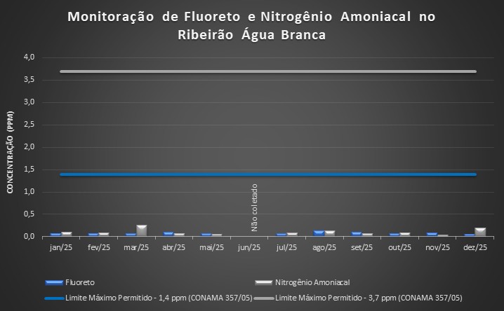 Os parâmetros fluoreto e nitrogênio amoniacal também são mensalmente monitorados neste ponto de amostragem e estão apresentados no gráfico 2. Os resultados encontrados também estão abaixo dos valores determinados pela Resolução do CONAMA para águas doces - classe II, que é de 1,4 mg/L F para Fluoreto (ou 1,4 ppm – parte por milhão) e de 3,7 mg/L N para Nitrogênio Amoniacal (ou 3,7 ppm).