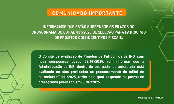 Entre em contato conosco caso tenha alguma dúvida sobre o Edital ou qualquer outro assunto relacionado ao processo de Patrocínio de Projetos da INB.